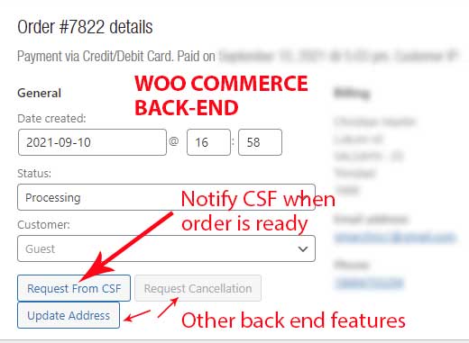 BACK END: Woo Commerce click to notify CSF for pick-up