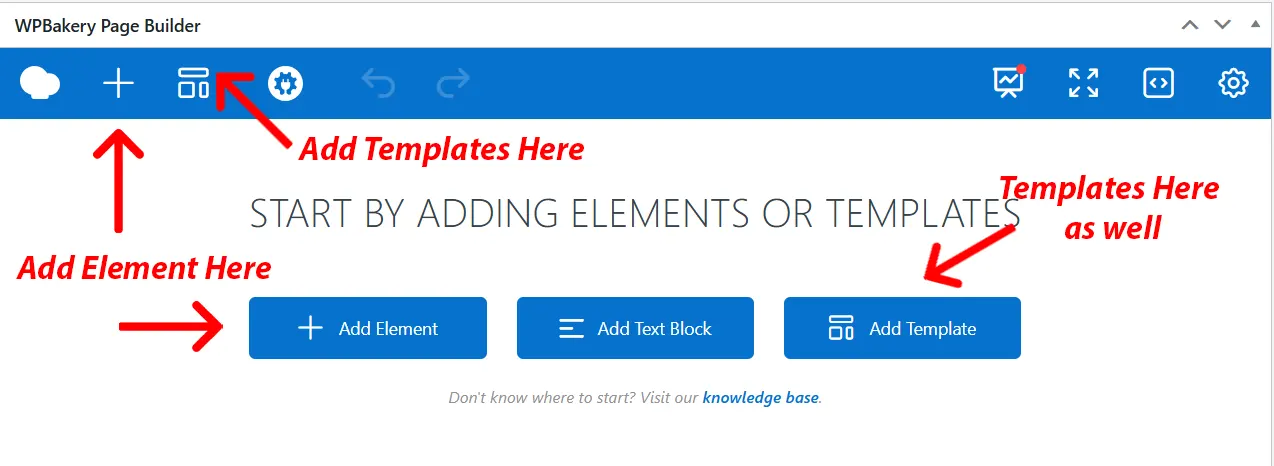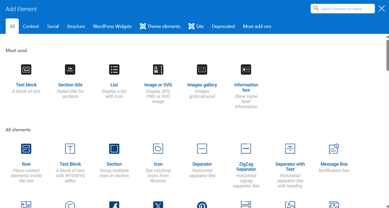 Below that, you can start building the page by selecting your layout of choice (usually the default WordPress layout). From here, 3 options will appear, “Add Element”, “Add Text Block” and “Add Template”. Adding an Element will open a panel that contains all of the possible tools to use in page building. You can start building a page from here by clicking on whatever element you choose.