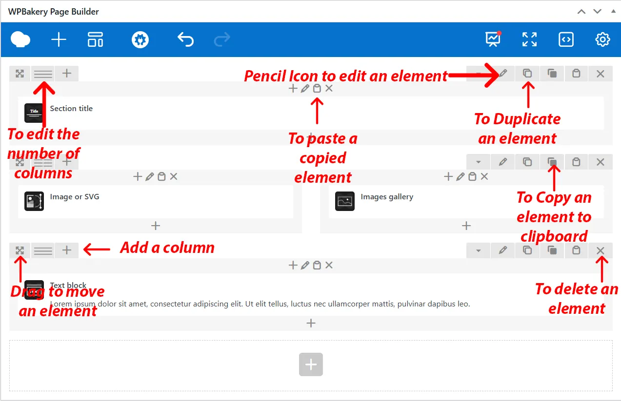 - Use the pages Icon in case you need to duplicate a Row or an element.